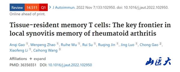 近日,我校第二医院风湿免疫科王彩虹教授团队在SCI-1区期刊Journal of Autoimmunity杂志(1区,影响因子14.511分)发表高水平论文《Autoimmun:组织驻留记忆T细胞——类风湿关节炎滑膜中的炎症记忆》。