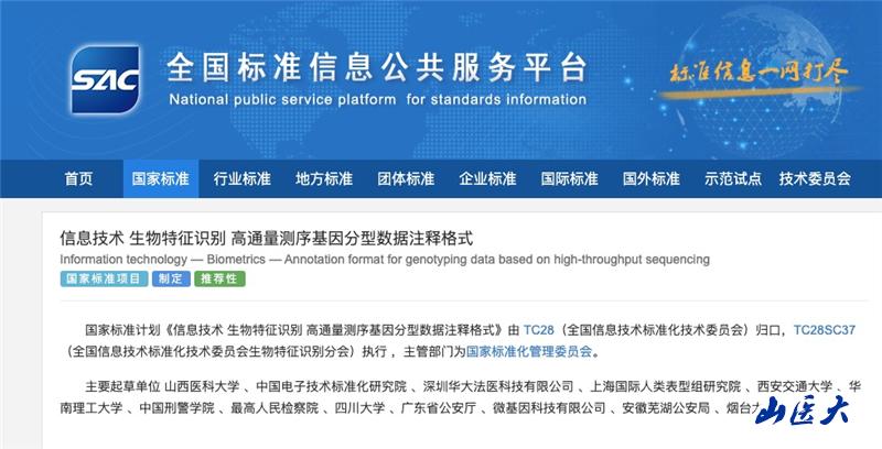 喜讯!我校牵头申报的国家标准《信息技术 生物特征识别 高通量测序基因分型数据注释格式》获批立项公示