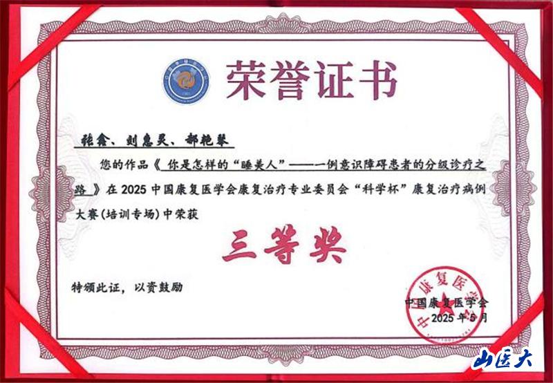 5月21日至25日,为推动康复治疗高质量发展,加强临床治疗、康复教学和康复科研的交流合作,第一医院康复医学科主任武俊英带领科室团队参加了在南京市举办的2025中国康复医学会康复治疗专业委员会学术年会暨康复治疗医工融合新技术新进展培训班。本次会议同期举办了中国康复医学会康复治疗专业委员会第五届“科学杯”康复治疗病例大赛,山西省康复研究中心附属医院康复科负责人张鑫、我校第一医院康复医学科治疗师刘惠灵、护士郝艳琴精心准备的案例“你是怎样的‘睡美人’——一例意识障碍患者的三级诊疗之路”》荣获三等奖。