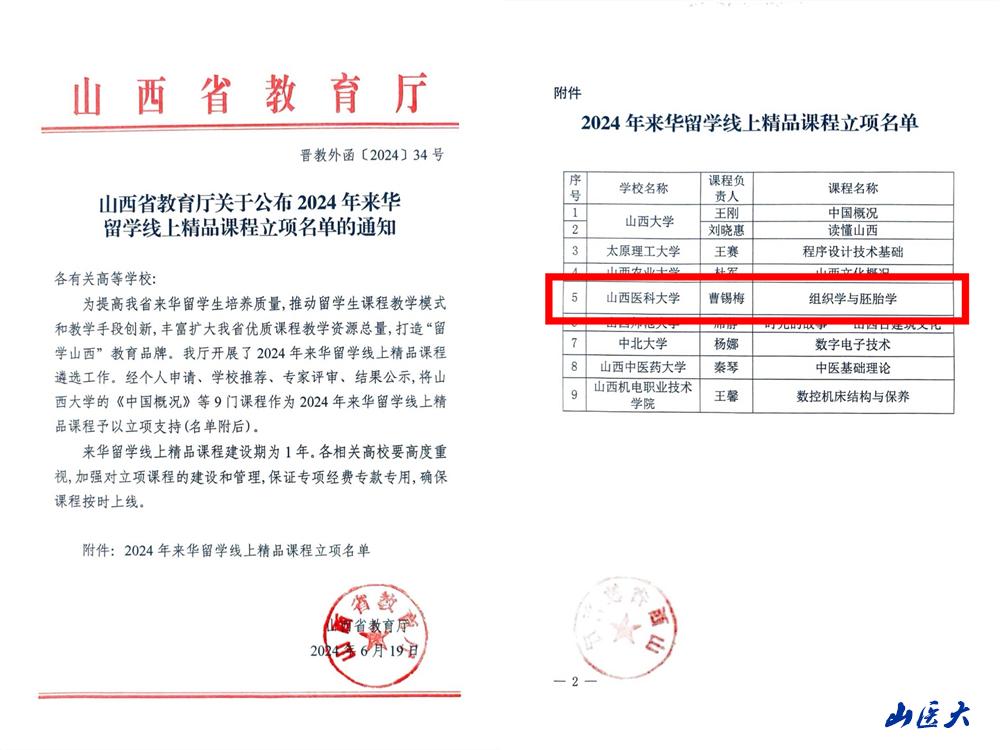 为全面推动留学生课程建设与应用,有效提升来华留学生教学质量和水平,打造“留学山西”教育品牌,培养既有专业素养又有中国情怀的高质量国际人才,山西省教育厅于近期开展了2024年来华留学线上精品课程遴选和建设工作。我校经过积极组织申报,最终基础医学院组胚教研室负责的《组织学与胚胎学》获得立项资助。