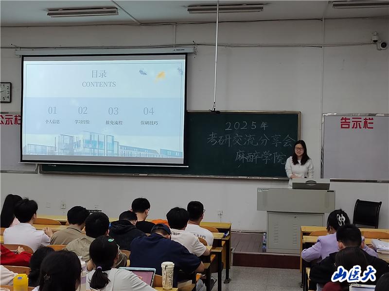 为帮助麻醉学专业学生明确考研目标、掌握备考方法,4月25日晚上,麻醉学院在迎泽校区举办了2025年考研经验交流会。2021级全体本科生及2022级全体本科生和2020 级已考取高校硕士研究生的学生代表参加交流会,思想政治辅导员李佳洁主持。